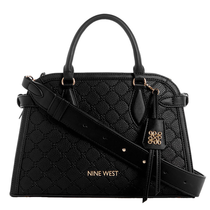 This black Adelaide Jet-Set satchel from Nine West offers internal organization with a zipper and slip pockets, hardware details, Nine West branding, and a zipper closure. It has a comfortable, adjustable, removable strap with a 23.58” drop and seasonal canvas material. The bag measures 12.2” x 9” x 4.13”.