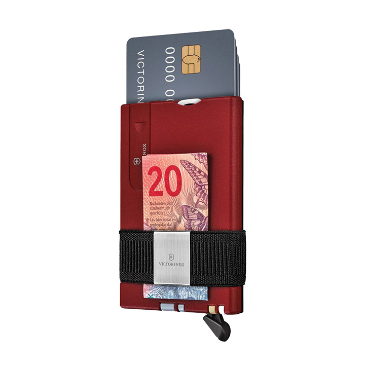 The Victorinox smart card wallet in iconic red combines a Smart Card with clever everyday tools like a small blade, scissors, nail file, screwdriver, tweezers, toothpick, and ballpoint pen. The slim, minimal design fits in any pocket and includes the ability to store six cards plus a unique patented mechanism to slide cards in and out easily. It’s made of ABS material.