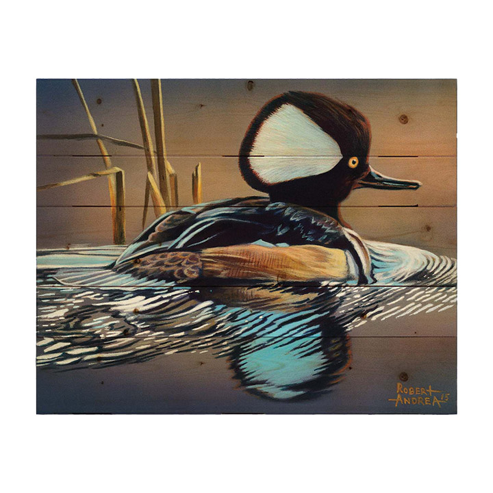 Experience the beauty of nature with “Hoodie” by Robert Andrea, a stunning painting featuring an exquisite hooded merganser duck, capturing its elegance as it floats on the water. Each wooden pallet is assembled in the U.S. and printed with UV-curing ink for high durability, image and color quality, and consistency. Measures 16” x 20”.