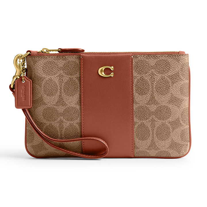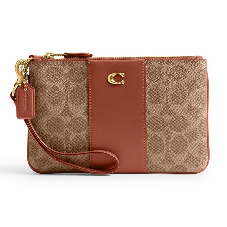 Crafted of signature Coach canvas and refined leather, this wristlet is perfectly sized for cards, cash, and a phone. Finished with Coach’s signature C hardware, you can wear it on your wrist or clip it into a larger Coach bag. The wristlet has a fabric lining, zip-top closure, two card slots, and a detachable wrist strap. Measures 7.5” x .5” x 4.75”.